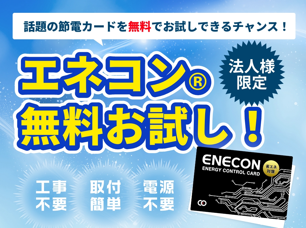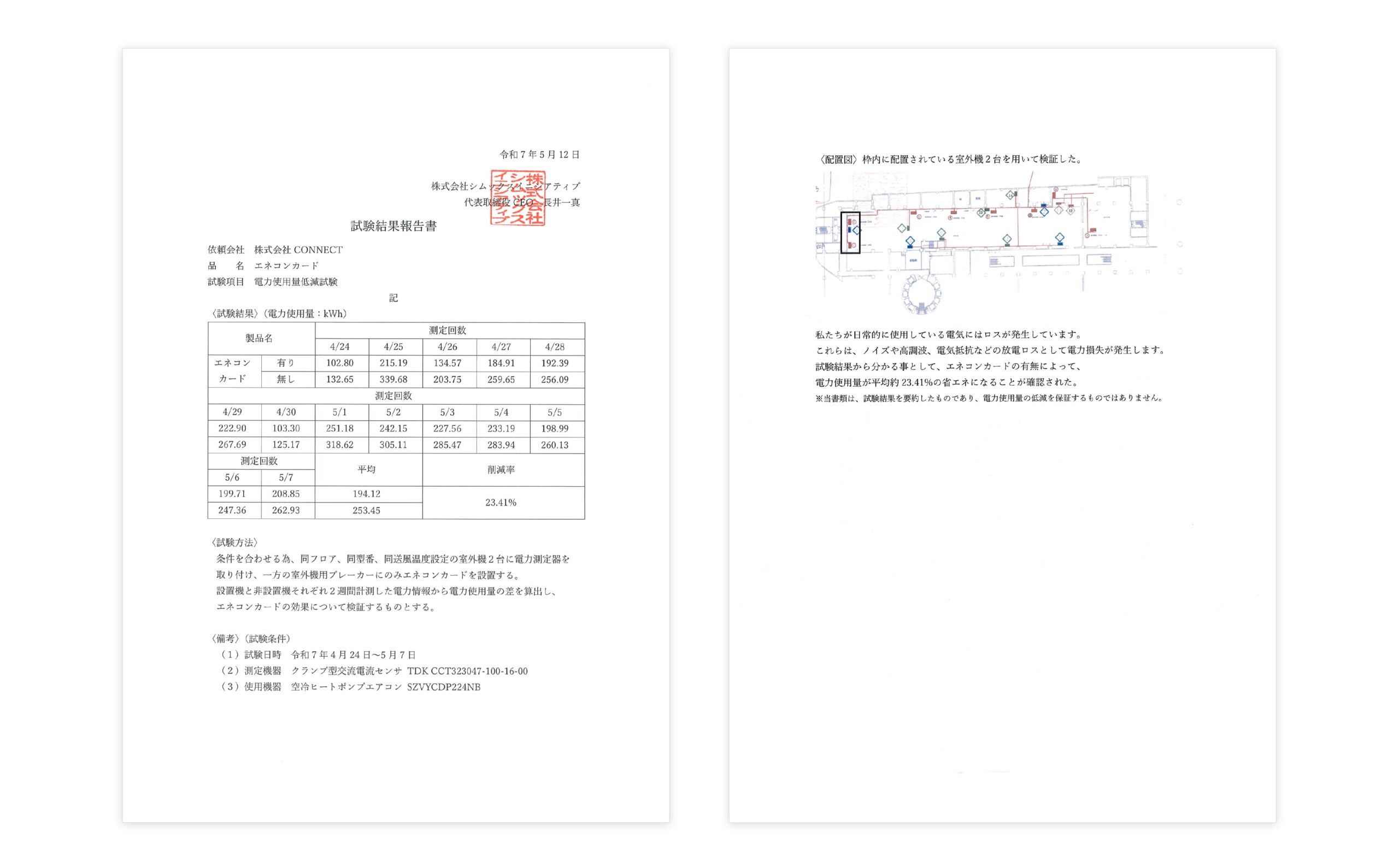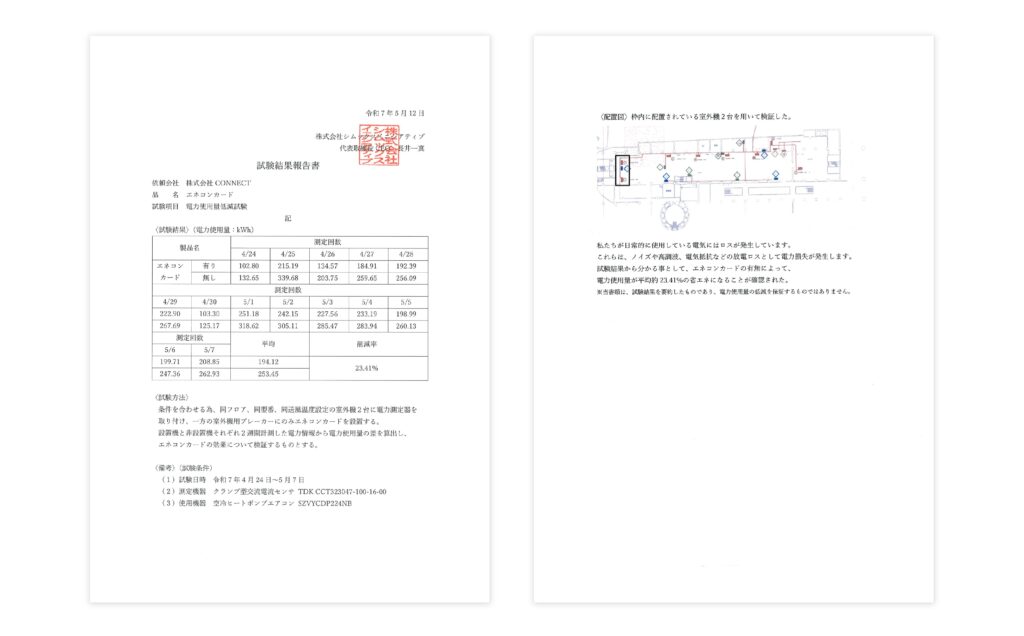 株式会社CONNECTにて試験を行い、エネコンを使用し、利用9時間の消費電力を電力メータにて測定した。エネコンを各ブレーカに1枚ずつ、動力ブレーカに2枚、合計4枚設置し、貼り付け前、貼り付け後を2日計測し、その消費電力を算出し、比較した。